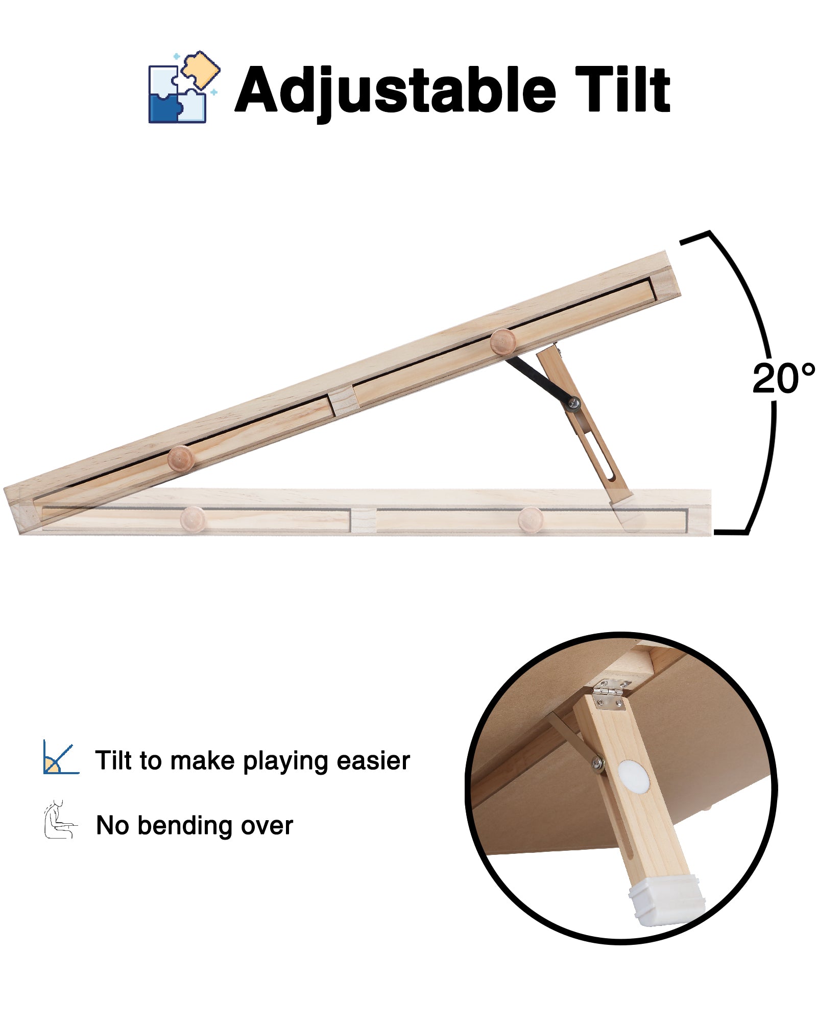 🧩 Tilt Up - The puzzle table can be propped up to help relief sore back. You can do the puzzles without putting the whole body on the table. The tilting leg can be folded when not in use.